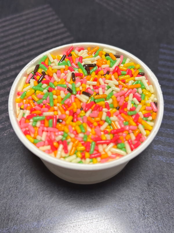 アイスとかパフェの上にのっている、カラフルなトッピングのことです。